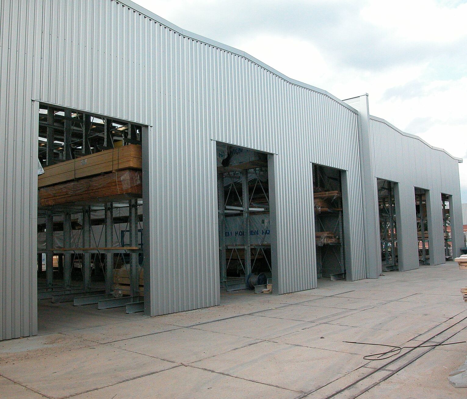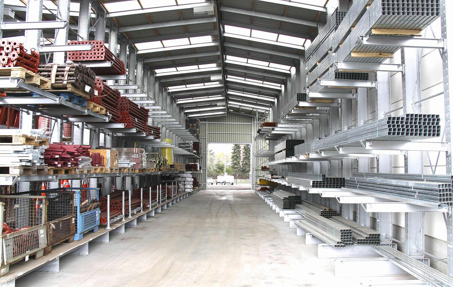 Auf der Basis von Kragarmregalen können sowohl offene als auch geschlossene Lagerhallen realisiert werden. Bei einem geschlossenen Lagersystem werden auf der Rückseite der Kragarmregale die Wandelemente befestigt, während zwischen den Regalzeilen Stützen angebracht werden, die ohne Probleme das ganze Dach tragen können. Als Wandverkleidung kann man Trapezbleche, Spundwände oder Sandwichpaneele einsetzen. Bei einer offenen Lagerhalle entfällt meist die Wandverkleidung. Trotzdem ist das gelagerte Material vor z.B. Schnee und Regen geschützt.